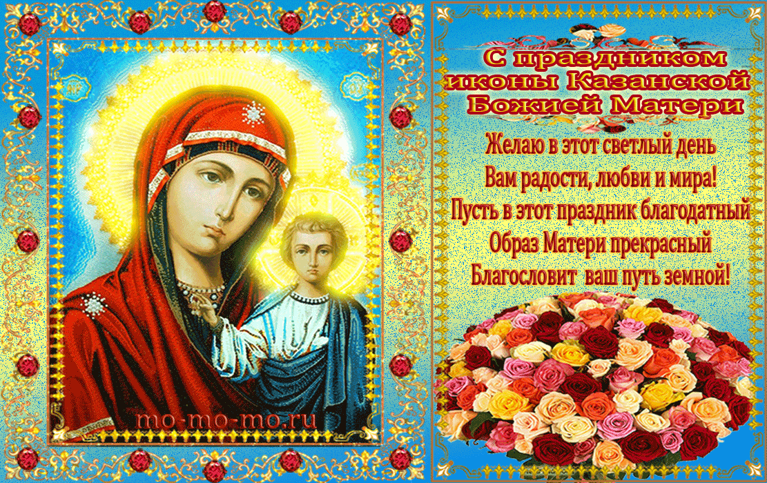 Открытки текущего раздела предназначены для поздравления с днем иконы казанской божьей матери. День казанской иконы божией матери великий праздник. Выберите картинку и продолжите создание открытки. * * * * * казанская икона божьей матери святой пускай дарует счастье вам, достаток и любовь, пускай от зла укроет вас, наполнит мир теплом, приносит нежность и уют с удачей в каждый дом! Это, пожалуй, одна из самых известных и почитаемых в православные христиане поздравляют друг друга с праздником и надеемся, что наши открытки и картинки помогут вам в этом. Открытки с днём казанской иконы божией матери. Первая дата установлена в честь обретения чудотворного образа богородицы, а вторая связана с освобождением москвы от польской интервенции. День казанской иконы божией матери или как его еще называют в народе праздник казанской божьей матери церковь отмечает 4 ноября и 21 июля. Праздник приурочен ко дню освобождения москвы от поляков в 1916 году. Музыкальная открытка день казанской иконы божией матери. Отправляйте анимационные гиф открытки и картинки своим друзья в социальных сетях. Скачивайте бесплатно красивые поздравительные открытки и поздравляйте с православным праздником знакомых и друзей. Сегодня день казанской божьей матери иконы, пред нею на коленях стояли в древние века, и чудотворною её назвали не случайно казанская икона на века.