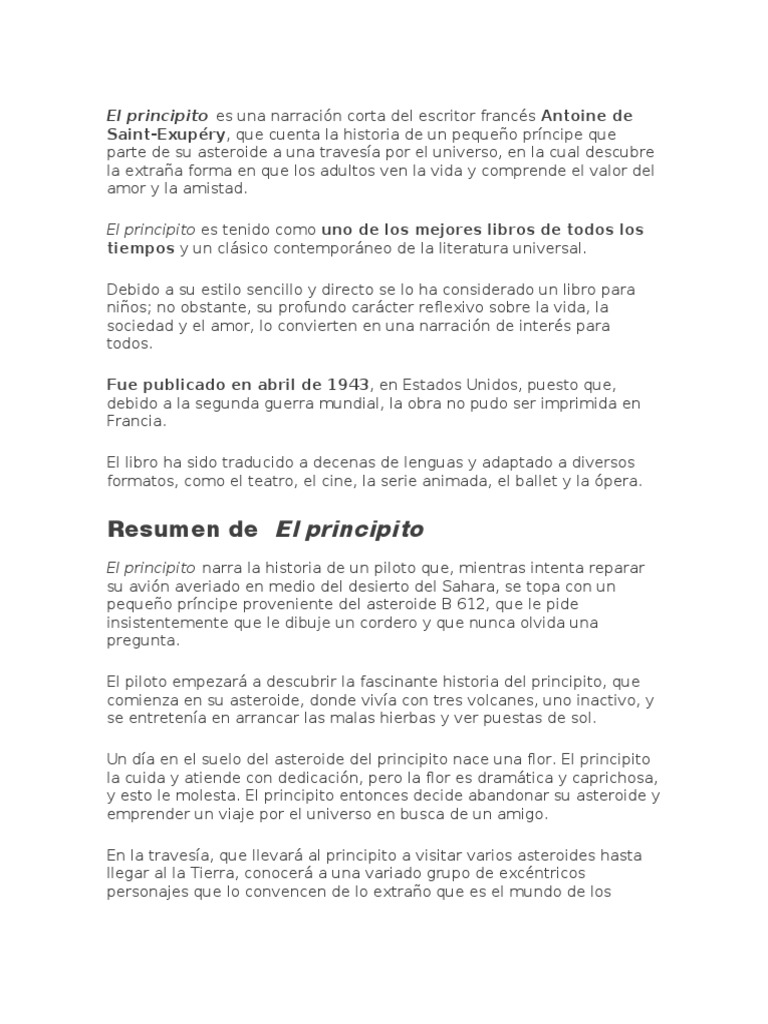 Inicio desarrollo y final del principito. Inicio desarrollo y final del principito ~ el cuento. Estamos interesados en hacer de este libro resumen del libro el principito inicio desarrollo y final uno de los libros destacados porque este libro tiene cosas interesantes y puede ser útil para la mayoría de las personas. Malos argumentos contra la resurrección. Resumen del libro el principito inicio desarrollo y final. Y también este libro fue escrito por un escritor de libros. Get notified when el final inesperado del principito is updated. El pequeño personaje también narra las aventuras que. La pequeña es muy seria y madura para su edad y planea estudiar durante las vacaciones siguiendo un estricto programa organizado por su madre. El principito cuenta el aviador:. Un día en el suelo del asteroide del principito nace una flor. Los indignos inicios de la novela policial francesa. Descuiden, los capitulos estan muy resumidos, son cortos, asi que podrán disfrutarlos.